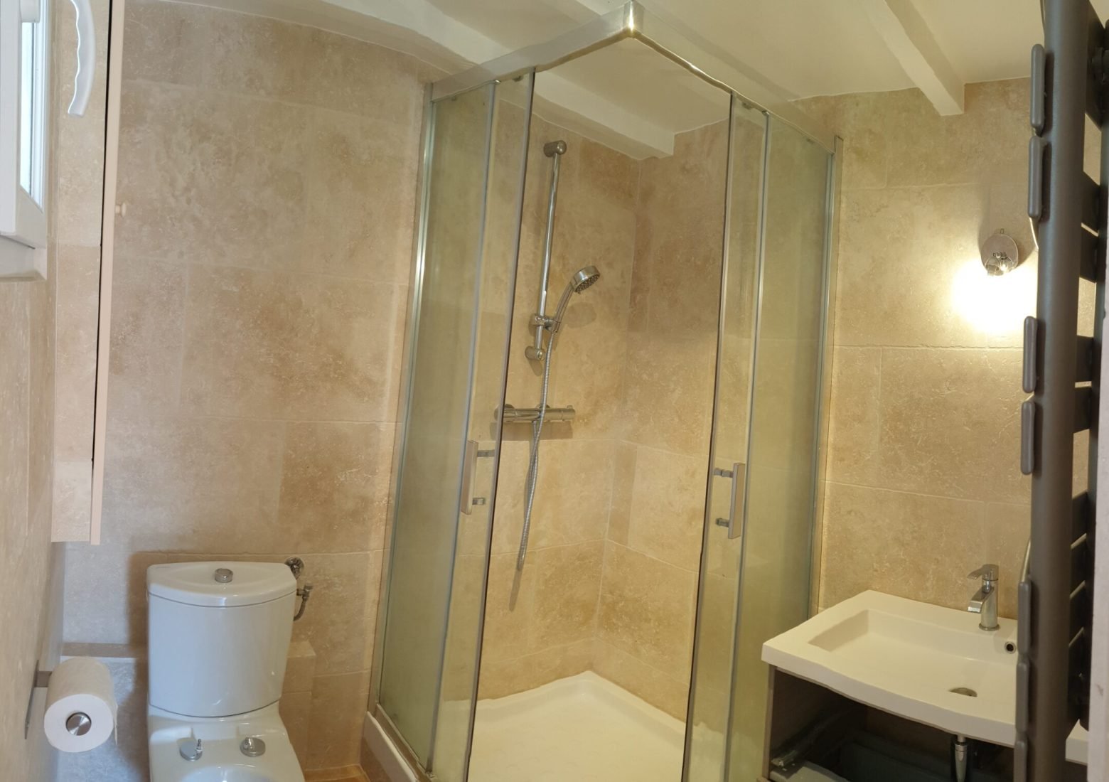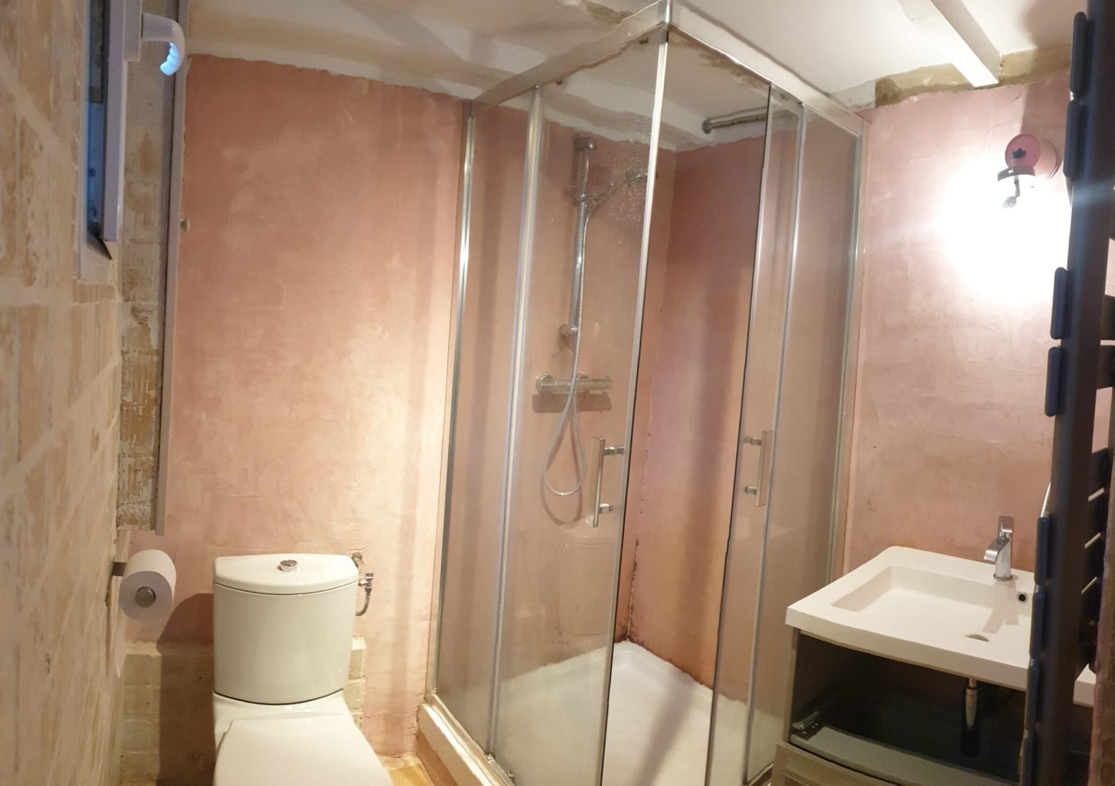 • Rénovation du coin douche avec cabine vitrée et robinetterie moderne,